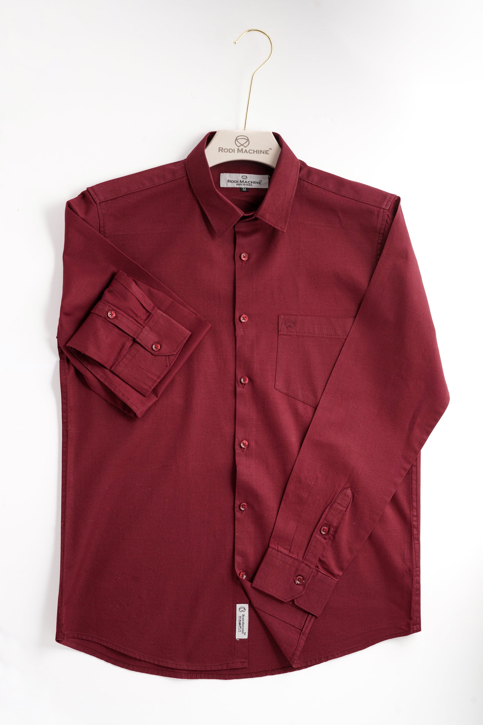 Maroon colour Rodi Machine shirt on a hanger against a white background